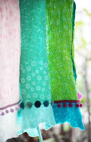 | "FILZEN PLISSÊ ARCO-IRIS" Junção feltrada que transforma um lenço quadrado (com a técnica plissê arco-iris) em uma echarpe colorida e cheia de texturas. |